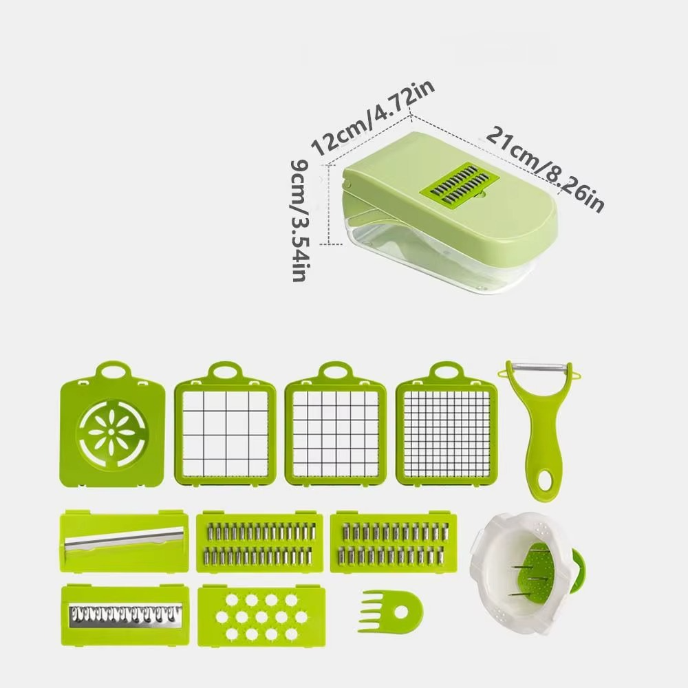 đ§ ă7 INTERCHANGEABLE BLADESăCut your produce like a pro with our newest vegetable chopper. It offers multiple ways to slice, shred, grate, and mince. The built-in chop lid lets you cut foods directly into the collection tray. This 18-piece set is sure to become a favorite in your kitchen tools.